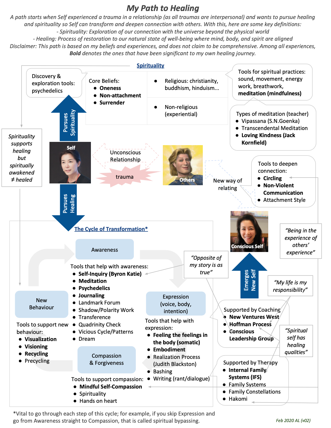 In order to be present and hold space for others, I’ve been relentlessly focused on doing my own inner work -- if I haven’t faced my own shadow, how can I be a mirror for someone else’s shadow without being triggered? So I was determined to go within as deeply as possible by trying all different modalities from Hakomi to Hoffman Process. After months of doing the work, I realized that these modalities are all interconnected. So I started to lay them out and that became this map, My Path to Healing. This map illustrates the modalities that I have tried and I know there are many other healing modalities so it does not claim to be comprehensive. My hope is to share my understanding of how each of them fits in this courageous journey of healing.